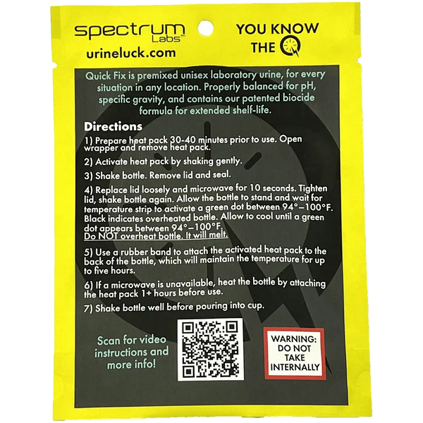 Quick Fix is premixed unisex laboratory urine, for every situation in any location.Properly Balnced for pH, specific gravity, and other characteristics. Contains our patented biocide formula for extended shelf-life.